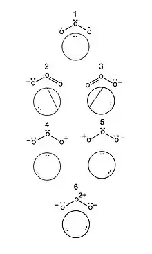 Determining the relative weights of each resonance structure of ozone requires, first, the determination of the possible VB structures for . Considering only the orbitals of oxygen, and labeling the orbital on the oxygen , has 6 possible VB structures by Rumer's method. Assuming no atomic orbital overlap, the structure can be represented by the determinants :[6]