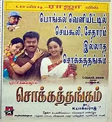 Chokka Thangam (transl. Pure gold) is a 2003 Indian Tamil-language drama film written and directed by K. Bhagyaraj and produced by G. Venkateswaran under the banner GV Films. It stars Vijayakanth, Soundarya, and Uma with Goundamani, Senthil, Prakash Raj, and Swathi playing supporting roles. The background score and music was composed by Deva. The film was released on 15 January 2003 and became commercially successful, it was remade in Bengali as Tyaag in 2004. The film also marked actress Soundarya in her last Tamil film.[1]