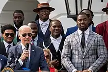 Jones (right) with President Joe Biden after winning his second Super Bowl.
