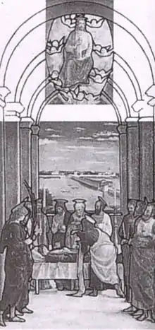 Roberto Longhi was the first to identify it as a fragment of the upper register of Death of the Virgin (Prado), probably for the private chapel of Ludovico III Gonzaga in the Castello di San Giorgio in Mantua. At its base is the arch which links it to the main painting. The design and decorative scheme for Ludovico's chapel was Mantegna's first official commission - he became court painter in 1460, but negotiations to bring him to court had begun three years earlier. During the 16th century the chapel was rebuilt and redecorated, with the 15th century paintings and decorations removed, though the 16th century scheme itself was later destroyed. Death of the Virgin ended up in Ferrara, as shown by its appearance in a 1588 inventory listing it as among the paintings in the small private chapel of Margherita Gonzaga, wife of Alfonso II d'Este - the part of the work showing Christ and the Virgin's soul may have been removed at this time to fit the work into its smaller new home.[4]