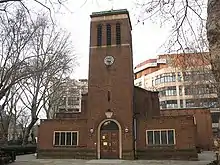 The church hall is the Wapping Memorial Sculpture by Ian Walters: New Regime (1989).[8]