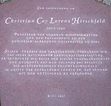 On the two-hundredth anniversary of the date of Hirschfeld's death, Kiel renamed a small green area on the edge of his former tree nursery 'Hirschfeld-Blick' (Hirschfeld Square), in which a small memorial plaque to him was placed in 1997. The Kieler Bürgerstiftung has been awarded to public gardens every two years since 2007.
