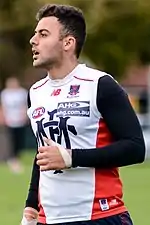 Salem was recruited by the Melbourne Football Club with their first selection and ninth overall in the 2013 national draft.[9] During the pre-season, he suffered from a thyroid issue which saw him lose six kilograms in the month following the draft.[10] He played the start of the season in the Victorian Football League (VFL) for Melbourne's affiliate team, the Casey Scorpions,[11] and after strong form in the VFL, including a thirty-two possession game in the VFL round three match against Frankston at Frankston Park,[12] he made his AFL debut a week later in the thirty-one point loss against Sydney at the Melbourne Cricket Ground in round six.[13] In his seventh match, Salem was pivotal in Melbourne's comeback victory against Essendon in round thirteen,[14] after marking the ball thirty metres directly in front of goal, he kicked the winning goal with nineteen seconds left in the match, giving Melbourne a one-point lead.[15] He finished his debut season with twelve matches[16] and senior Herald Sun football writer, Jay Clark, wrote he had the potential to become one of Melbourne's best players.[17]