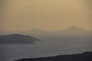 The Christiana Islands viewed from Santorini. The Kameni Islands are in the front and Cape Akrotiri on the left side. Askania is on the left and Christiani on the right.