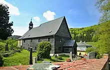 The village of Kryštofovo Údolí is protected as a village monument zone for a preserved set of folk architecture, consisting of multi-story houses with a timbered ground floor and half-timbered floor.[6] The landmark and the most valuable monument is the wooden Church of Saint Christopher. It was built in the early Baroque style in 1683–1684. It is one of the few preserved timbered building with slate cladding. The walls and ceiling of the church are decorated with fifteen paintings from the life of Christ. Next to the church are wooden bell tower and mortuary, and a Baroque rectory from 1786.[7]