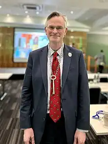 ![]() Boes, seen in 2023 wearing the latchkey symbol of the American Osler Society | |