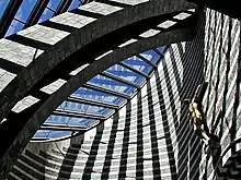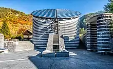 The church has a structure with an elliptical plan, with an inclined circular glass surface that serves as a roof. It is enjoined by two outdoor spaces, a recessed seating area on its west side, and a small plaza on its north. With respect to a longitudinal plane it can be noted that the most significant element is the rampant arch, which, according to the will of the designer, symbolizes the arch of the ancient church that protected part of the village of Mogno from the avalanche of April 25, 1986 that completely overwhelmed and destroyed the old church. The two bells, dated back to 1746, are the only elements recovered after the avalanche.[3] The interior set-up is very simple: it consists exclusively of two rows of wooden benches arranged in axis with respect to the altar: the altar, of white marble, consists exclusively of two blocks. On the left side there is a statue of the Madonna, that stands over a baptismal font in light marble.[4] The construction materials are: the gneiss coming from Riveo quarries, the white marble of Peccia valley, iron for the supporting structure of the roof, and glass for the roof.[5]