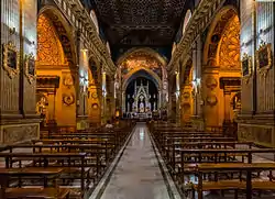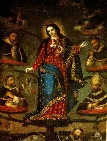 The three levels of the chapel respond to a kind of stratification: the lowest was intended for the common citizen, the second for the priest and the authorities, and the third for the Virgin of the Rosary. Since 1650, three confraternities worked in this chapel;[4] the first of peninsular Spaniards and Spaniards born in America (criollos), the second of black and mestizo edges, and finally another formed entirely by indigenous people. Each group had its corresponding space in a kind of smaller chapels. The Chapel of la Virgen del Rosario was finished in 1732.[1]