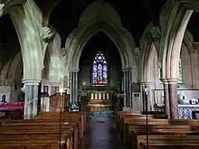 The church's wooden fittings were carved from oak sourced from Fairfield, the estate of Sir Acland. Many of them, including the pews, pulpit, reading desk, reredos and stalls in the chancel, were carved by Mr. Davis of Taunton. The octagonal font belonged to the previous church and dates to the 12th century.[3] The carving of the interior stone corbels was carried out by Farmer of London. The passages of the nave was laid with Minton's tiles and the chancel laid with Minton's encaustic tiles. The stained glass windows in the chancel and north chapel were by O'Connor of London, and the small stained glass window in the baptistry by Messrs Hardman of Birmingham. The organ was supplied by Walker of London.[5][4]