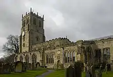 The church is located at what is known as the 'Top of the Town' which is at the northern end of the high street. The churchyard is set with yew trees and falls away to Bedale Beck to the east.[3] The church features in the book England's Thousand Best Churches by Simon Jenkins.
