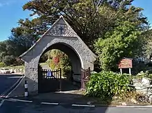 In front of the porch is a 19th-century Celtic cross by Joseph Clarke[3] on the four steps of the old churchyard cross.
