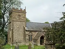 The hamstone building has slate roofs.[1] It is 57 feet (17 m) long and consists of a three-bay nave and two-bay chancel.[1][2] The 40 feet (12 m) high two-stage tower is supported by buttresses.[1][2]