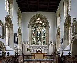 The chancel is the most richly decorated part of the building, featuring most of the surviving medieval stained glass in the church. The windows have beautiful geometric tracery, with similarities to the now ruinous Tintern Abbey in Monmouthshire, Wales, and decorative arches with carved foliage.[11] The chancel roof is a simple 19th-century construction. It has High Victorian Gothic fittings, including choir stalls, reredos and altar.[4]