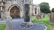 Whilst the church itself is Norman and medieval, the stone cross that is just outside the porch is of Anglo-Saxon origin. It is believed to have been carved in the 8th or 9th centuries and to have been dedicated to St Wilfrid, who was Bishop of Ripon between 667 and 669.[27] The cross, which is 6 feet 9 inches (2.06 m) tall and 2 feet 0 inches (0.6 m) in diameter, used to be known as the Paulinus Cross and is decorated with early Christian carvings.[28] Many of the carvings and representations have weathered over time, though Fisher argues that some were probably removed by those with Puritanical leanings during the Reformation.[29] It is similar to the types of crosses found in churchyards in Wolverhampton and Dewsbury.[30] The cross was grade II listed in 1966.[31][32] The church is located on the south eastern corner of the market square in Masham town centre, though the entrance faces south with views of the countryside in that direction.[33]