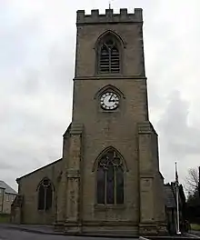 The Church of St Matthew lies to the north of the A684 road on the eastern side of Leyburn,[7] and was built on land donated by Lord Bolton.[8] It is the only church designed by Christopher George Wray,[9] and has been described as being in a Geometrical style[note 1][10] with a tower on the west side.[11] The tower displays the only public clock in Leyburn town.[12] The building of the church cost £3,000 and was paid for by public subscription,[4] although the original intent was for a much larger building, but funding was not sufficient enough.[13] A stipulation of the works was that no burials were permitted in the churchyard, and despite one former churchwarden being buried there in 1955, this has been adhered to.[note 2][2][14]