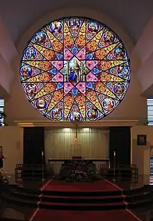 View of the 16-paneled stained glass window, created by Joël Mône and realized by Vitrail Saint-Georges, from the third level of church building.