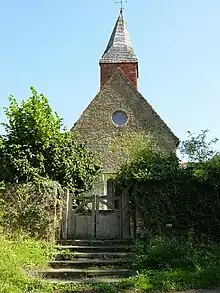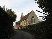 The present church, a simple sandstone building,[3] was built at the end of a lane a short distance from the church in neighbouring Thakeham in about 1220.[7] Early in its history it was, like its mother church at Steyning, owned by the Benedictine abbey at Fécamp in Normandy, to which tithes were payable.[1] A connection with Steyning was maintained until the early 17th century, when the Church of the Holy Sepulchre became independent.[1] Structurally, the church changed little from its early 13th-century appearance: a long single room with no division (in the form of a chancel arch) between the chancel and nave and an unbroken roofline over them, lit by lancet windows on each side and an oculus above the entrance.[3][8][9][10] Above the west end, the wood and shingled bell-turret is the oldest part of the building: its timbers have been dated to c. 1158. The bell it houses, cast in about 1200, is one of the oldest survivors in Sussex.[1][7]