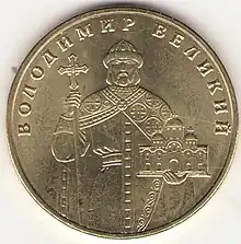 Coin of Ukraine, featuring Volodymyr the Great and a model of the church