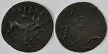 Numismatist Michael Mitchiner speculates that the Chutus may have been of Indo-Scythian (Shaka) origin.[7] According to him, some Chutu coins bear designs copied from the Indo-Scythian coins. For example, the obverse of the two lead coins found at Kondapur features a swastika surrounded by a legend "reminds one of the Kshaharata coins stuck for Ladhanes and Pisayu"; the reverse of the same coin bears an arrow and a thunderbolt that seems to be derived from the coins of Bhumaka and Nahapana. According to V. V. Mirashi's interpretation, the issuers of such coins variously call themselves Shakas or members of the Chutu family.[14] Mirashi and Mitchiner read the legend on the coin as Mahasenapatisa Baradajaputasa Saga Mana Chutukulasa, which means "of the Maha-senapati (chief commander) Saka Mana, the son of Baradaja, of the Chutu family.[15] Mitchiner notes that according to a Nashik inscription, the Satavahana king Gautamiputra Satakarni issued an order from his "camp of victory" at Vaijayanti (the ancient name of Banavasi).[14] He theorizes that the Chutus were originally Indo-Scythian chiefs, who became Satavahana feudatories, when Gautamiputra defeated the Indo-Scythian king Nahapana around c. 125 CE. Subsequently, they participated in the Satavahana military campaigns: one Chutu chief was appointed as the Mahasenapati in the Kondapur region, while another was appointed to govern the newly-captured city of Banavasi.[16]