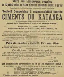 Katanga is in the heart of the continent and has no navigable water route to the ocean. The ores from the rich copper mines of the region had to be refined to reduce their bulk, and thus cut transport costs. Cimenkat was one of a number of construction-related companies founded to support housing for the growing workforce and other types of construction for the mining companies.[1] The Société Ciments du Katanga was created by royal decree on 16 January 1922 to supply cement to the rapidly growing Union Minière du Haut-Katanga (UMHK) and other companies in southern Katanga and the two Kasais. The founders included the Société Belge et Minière du Katanga, the Compagnie du Congo pour le commerce et l'industrie, the Banque de Paris et des Pays-Bas, the Belgo-Katanga and others.[2]