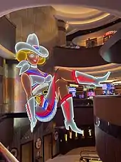 The resort's design includes references to past and modern Las Vegas history.[44][58] Various forms of artwork, including murals, are featured throughout Circa.[59] The resort's lobby incorporates the former Vegas Vickie cowgirl sign that once advertised Glitter Gulch.[60][18][15]
