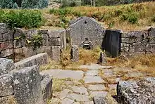 The Citância de Sanfins is an archaeological site of the Castro culture located in the Portuguese civil parish of Sanfins de Ferreira in the municipality of Paços de Ferreira.[1] The construction of the Castro site developed over many phases, between the 5th century BCE and the 2nd century CE.[2] The Castro had a period of Roman occupation that started during the 3rd Century CE, being abandoned during the 4th Century CE.[1] The site also includes a chapel dedicated to Saint Romanus (c. 14th Century) and 34 graves belonging to a Christian cemetery from the Medieval age (c. 13th Century CE).[1] The Castro was first dug in 1895 by Francisco Martins Sarmento e José Leite de Vasconcelos and the last interventions were in 1995, when one of the houses was reconstructed and a warrior statue replica was put near the entrance of the second wall.[3]