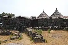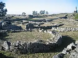 The Citânia was protected by three lines of walls, with an exterior wall protecting the West and South and a moat in the North and South.[2] These walls were created using local granite blocks.[2] About 160 houses have been found within the Citânia walls.[4] Most of these houses are circular, with diameters of about 5m, granitic stone walls, and conic ceilings made of perishable materials.[2] These houses typically form neighborhoods of 4 or 5 buildings, facing a common patio and surrounded by a wall, forming areas of 200-300m2.[4] On the periphery of the Citânia, a public bath building was found.[4] Warrior statues were found in the Citânia, one of them overseeing the main entrance of the Citânia.[2] The Citânia has a main road with a north–south orientation and collateral roads of east–west orientation.[4]