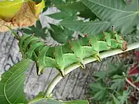 Caterpillars are quite large, as with many others in the Citheronia genus, and are prominently green, with long prolegs that sport black 'racing stripes' and red 'horns' along each segment of their body. They also have an alternating pattern of a black stripe on each segment, that terminates at the spiracle (arthropods). Their dorsal side is darker green than their ventral side.