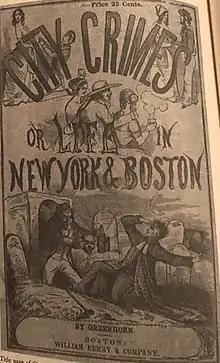 City Crimes; Or, Life in New York and Boston is a 1849 novel by George Thompson, writing under the penname of "Greenhorn". The novel was written for the working class and meant to give a shock to its readers through its use of graphic violence among several characters and sexual promiscuity, specifically among women. It is considered by critics to fall within several genres such as sensational literature and urban gothic and to have laid the groundwork for the city mysteries genre.