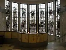 At the east side, above the entrance to the basement, a half circular balcony was built. With a similar half circular extension, a new and elegant stairwell was made, which contains a broad marble spiral staircase. The circular extension have stained glass windows made by stained-glass artist Joep Nicolas. The scenes in the stained glass express the virtues of a number of administrators and figures from classical antiquity.