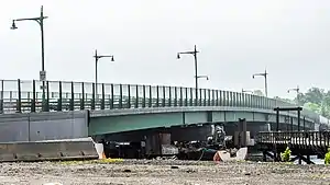 A temporary steel bridge was erected in 2015, but a partial collapse in September delayed the opening of the temporary bridge.[30] On December 16, 2015, the New York City Department of Transportation (NYCDOT) conducted a road test on the temporary steel bridge by running heavy equipment including fire trucks over the bridge.[31] The NYCDOT conducted the tests to ease residents' concerns about the integrity of the temporary structure.[31] Two days later on December 18, the original bridge was closed, and traffic was routed to the temporary bridge.[11][32] Shortly after that, the city began demolishing the original bridge, with the new bridge being constructed on the same site as the 1901 bridge.[11] The new bridge opened on October 29, 2017.[33]