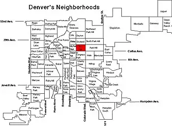 The City Park neighborhood highlighted on this map of Denver's neighborhoods