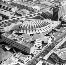 The Aula Magna is located between the main plaza elements of the Plaza Cubierta and the University's main library building. The interior of the hall is considered artistically and architecturally significant, especially its most notable feature, Alexander Calder's acoustic 'clouds', which serve both aesthetic and practical functions.[4] They contributed to the science of interior space acoustics.[14] The concrete shell-shaped building exterior is also architecturally significant.[4] It has been named the "most important auditorium" at the university.[15] The current director of the hall is Trina Medina, with the assistant director Rosario Silva Prieto.[16]