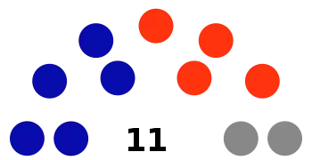 Liverpool City Council is composed of eleven councillors, including the mayor, for a fixed four-year term of office. The mayor is directly elected while the ten other Councillors are elected proportionally as two separate wards, each electing five councillors. The most recent election was held on 4 December 2021, and the makeup of the council, including the mayor, is as follows:[7][8][9]