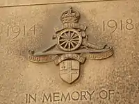 Annual training for 1st London Division had just started when war was declared on 4 August 1914, and the City of London Brigade promptly mustered at Bloomsbury for mobilisation.[24] The infantry of the division were soon posted away to relieve Regular Army garrisons in the Mediterranean or to supplement the British Expeditionary Force on the Western Front. By January 1915, only the artillery and other support elements of the division remained in England, and these were attached to the Second Line TF division (58th (2/1st London) Division) that was being formed. The City of London Brigade became 1/I City of London Bde and formed 2/I City of London Bde, which served with the 58th Division throughout the war.[24][25][26][27]
