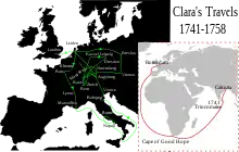 Clara (c. 1738 – 14 April 1758) was a female Indian rhinoceros who became famous during 17 years of touring Europe in the mid-18th century. She arrived in Europe in Rotterdam in 1741, becoming the fifth living rhinoceros to be seen in Europe in modern times since Dürer's Rhinoceros in 1515. She was known as the Dutch rhinoceros and received the name Miss Clara in the German town of Würzburg in August 1748. After tours through towns in the Dutch Republic, the Holy Roman Empire, Switzerland, the Polish–Lithuanian Commonwealth, France, the Kingdom of the Two Sicilies, the Papal States, Bohemia and Denmark, she died in Lambeth, England.