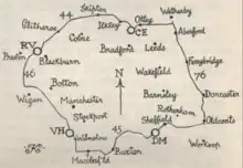 The cycling journalist, Kuklos (i.e.Fitzwater Wray), was a supporter of the Clarion Cycling Clubs who wrote for The Clarion Cyclist. In 1936 he described a circular route taking in four of the clubhouses.[1]