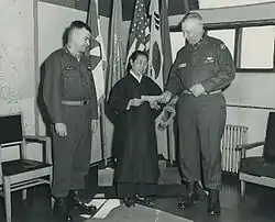 LTG Claude B. Ferenbaugh (right), deputy Eighth Army commander, presents a check for $595 to Mrs. On Soon Whang, director of the Orphans' Home of Korea, Cheju Island. Chief of staff BG Dwight E. Beach observes. The check is the semi-annual interest on the orphanage's perpetual support trust fund. Stars and Stripes, March 1, 1955