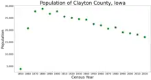 Clayton County is a county located in the U.S. state of Iowa. As of the 2020 census, the population was 17,043.[1] Its county seat is Elkader.[2] The county was established in 1837 and was named in honor of John M. Clayton,[3] United States Senator from Delaware and later Secretary of State under President Zachary Taylor.