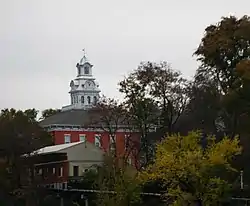 The new courthouse is the first part of the present building that was completed in 1868, and measured 75 by 25 feet (22.9 by 7.6 m).[4] The red brick structure featured a stone foundation, arched windows with finely dressed capstones, two offices on each floor, and two vaults between the downstairs offices. Ten years later a 75 by 50 feet (23 by 15 m) addition was built. This gave the building its present square form. The stone for the foundation was quarried locally, it had the same red brick, and the trim is wood painted white. The building, which follows the Italianate style, is capped with a hip roof. The two-stage clock tower was added in 1896. The tower is surrounded by an observation platform and it is capped with a black arrow weathervane. A new front entrance was added to the building in 1971. The double staircase on the interior is not original, but its banisters and newel posts are from the original.[4]