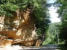 Clear Creek is located within the Hocking Hills region of Ohio, with gorges and bluffs formed by Blackhand sandstone. Because it is farther west than most other lands within the region, the erosion-resistant sandstone occurs at higher elevations.