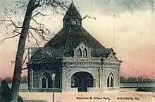 Even before the city purchased the old Thompson/Hopkins estate from the Johns Hopkins University Board of Trustees, a portion of the land was used for development of a reservoir for the area's municipal water supply system. Called Lake Clifton, the 30 acre reservoir was 30 feet deep and had a capacity of 265 million gallons of water when it was completed and put into service on December 27, 1888.[4] Related to the reservoir's operation, the Clifton Park Valve House was completed in 1887 to regulate the flow of water into adjacent Lake Clifton.[4] The valve house is an 8-sided distinctive stone structure with a cone tile roof and stained glass windows. It had eight valves controlling water entering through a large tunnel. Although the valve house still stands, it is in a dilapidated condition and the stained glass windows were destroyed by vandals sometime in the 1970s.[4]