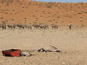 Climate change has had a significant impact on agriculture and livestock in Namibia, resulting in consequences on food security and the livelihoods of many Namibians. Due to climate change, Namibia is experiencing more frequent and severe droughts, leading to decreased availability of water for agriculture and livestock. Consequently, this directly affects crop yields and the access to water for livestock.[3] The changing climate has also caused unpredictable rainfall patterns, making it challenging for farmers to predict the optimal times for planting and harvesting. This unpredictability can lead to lower crop yields and decreased agricultural productivity.[17] Livestock farming plays a crucial role in Namibia's agriculture. However, climate change-related factors such as rising temperatures and the spread of diseases have a negative impact on livestock health and productivity.[18][19] Therefore, livestock farmers adapt their practices to cope with these challenges.[17] In order to mitigate the effects of climate change, Namibian farmers are increasingly adopting conservation agriculture practices.[20][21] This approach involves minimizing soil disturbance, implementing cover crops, and implementing crop rotation to enhance soil health and water retention, ultimately improving resilience to climate variability. Several projects, including those supported by the World Bank and the United Nations Development Programme (UNDP), are focused on promoting climate-resilient livestock systems, as well as enhancing traditional crops and livestock farming practices in Namibia. These initiatives aim to assist farmers in adapting to the changing climate and building resilience in their agricultural and livestock operations.[22][23][24]