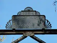 The superstructure is eight panels and includes a floor system made up of 3-by-12-inch (7.6 by 30 cm) treated timbers on five-inch (13 cm) steel I-section stringers which are themselves supported by 12-inch (30 cm) steel I-section floor beams. These beams are fastened to the hip verticals with riveted plates and are riveted directly to the intermediate posts, except for one exception: the first post to the east on the south side is welded to the floor beam with a steel plate set eight inches (20 cm) off-center; it is uncertain whether this was a repair or a correction of the design as it was being built. Both top and bottom lateral bracing consists of eye rods stabilized at intersecting points with bolted plates. The top chords, end posts, and intermediate posts are channels with riveted cover plates and lacing bars. The hip verticals are double forged eye rods, while the diagonals are double punched eye bars. The counters are turnbuckles. The lateral and portal struts are double angles to which portal bracing (double angles) is connected with ledger plates. The portal struts and bracing make up a riveted unit which is bolted to the end posts. Two-by-six-inch (5.1 by 15.2 cm) wooden guard rails are bolted to the bridge with angle sections. A builder's plate is fastened to the top portal struts at each end of the bridge.[3]