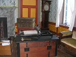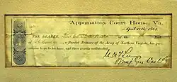 At the time of General Lee's surrender to Union commander Grant in 1865 the Tavern and its associated outbuildings were owned by Wilson Hix. Billy Hix, Wilson's son, was the sheriff of the village of Appomattox Court House then. Brigadier General George H. Sharpe, as head of the Bureau of Military Information and Assistant Provost Marshal, made the Clover Hill Tavern his headquarters starting on April 10, 1865. Sharpe was designated by Grant to oversee the printing of parole passes which were issued to the Confederate veterans. Research by historians of the Park reveal that perhaps the paroles were printed in the wooden dining room wing at the west end of the Tavern that no longer is there.[4] The paroles allowed the surrendered Confederate soldiers to travel unmolested to their homes.[5]