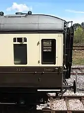 The "Dreadnought" was also the first GWR carriage with internal compartment doors, but as these did not go down well with the travelling public, the next design reverted to external compartment doors.[2] The Concertina design of 1906/7 reverted to 9 feet (2.7 m) width but retained the 70 feet (21 m) length. The doors were recessed into the body side rather than flush with the outer panels, and as each carriage was placed in a fixed-set, the company had fitted bellows-like material connections between carriages to smooth the airflow.[2]