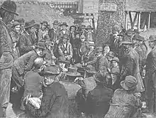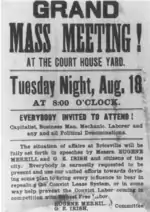 By summer 1892, dozens of newspapers and magazines nationwide, including The New York Times, the Alabama Sentinel, and Harper's Weekly, had sent correspondents to the Coal Creek region to cover the conflict. Sentiment was initially pro-miner, although as violent outbreaks continued and militiamen were killed, sentiment began to shift.[3] The Nashville Banner called the miners "thieves, robbers, ruffians, and outlaws,"[1] while the Chattanooga Republican accused the state legislature of being "inhuman."[1] The two Knoxville papers, the Journal and the Tribune, initially praised the miners' decisiveness and derided the government's ineffectiveness, but their sentiments shifted after the stockades were burned in October 1891.[6][7]