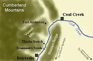 The Coal Creek War took place on the eastern fringe of the Cumberland Mountains, where the range gives way to the Tennessee Valley. Coal Creek, a tributary of the Clinch River, flows north for several miles from its source in the mountains, slicing a narrow valley between the backbone-like Walden Ridge on the east and Vowell Mountain to the west before exiting the mountains eastward through a water gap in Walden Ridge. A flank of Vowell Mountain known as "Militia Hill" overlooks this water gap.