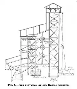 The Dodson Colliery was located at Bull Run in Plymouth Borough, and its breaker stood alongside the tracks of the Lackawanna & Bloomsburg Railroad. The Dodson's coal lands ran from Center Avenue on the west to Pierce Street on the east, and thus the Dodson's mining operations took place beneath the central business district of the Borough. The colliery was first developed by Fellows & Dodson, Co., beginning in 1869, and by 1870 a large breaker had been built and a shaft sunk to a depth of 220 feet (67 m).[55]
