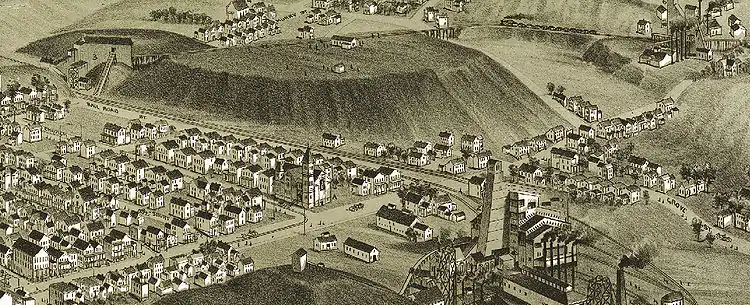 The Swetland Shaft was located on the northwest corner of the intersection of Vine and State streets in the Poke Hollow section of what is now Larksville Borough. According to court records, William Patten and Thomas Fender established this mine in 1851.[81] About 1855, Patten and Fender contracted with an English immigrant, John Dennis (a future Plymouth burgess), to sink a shaft to the coal seams below. It was said to be the first mine shaft on the west side of the Susquehanna River.[82] In January 1857, William Patten died when he fell down the newly constructed shaft.[83] Fender continued to operate the mine, but on February 25, 1860, lost the property at sheriff's sale.[81] Josiah W. Eno built a breaker at the mine in 1857, which he operated until 1861.
